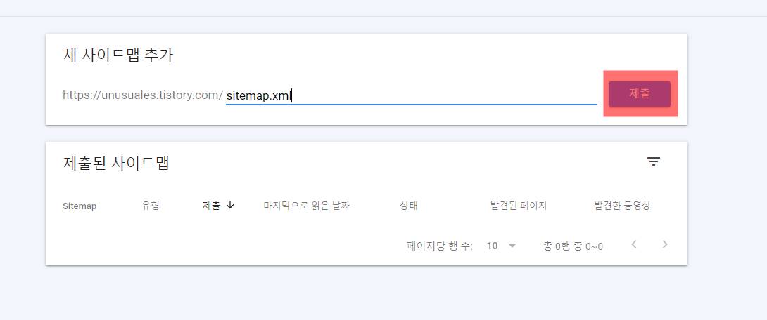 구글 웹마스터도구에서 새 사이트맵 추가를 하시고 위와 같이 sitemap.xml 만 입력하고 제출을 누르면 끝납니다