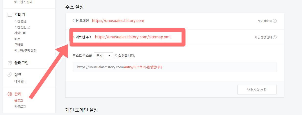 티스토리 관리 > 블로그 > 주소 설정에 사이트맵 주소가 나옵니다.